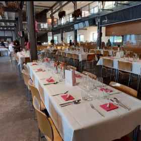 Die Tische in der Inatura wurden mit liebevoll zusammengestellten Blumenarrangements dekoriert. Im Eingangsbereich konnten man das neue Logo der Frauenselbsthilfe nach Krebs auf Limonadenflaschen entdecken.