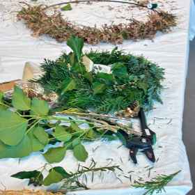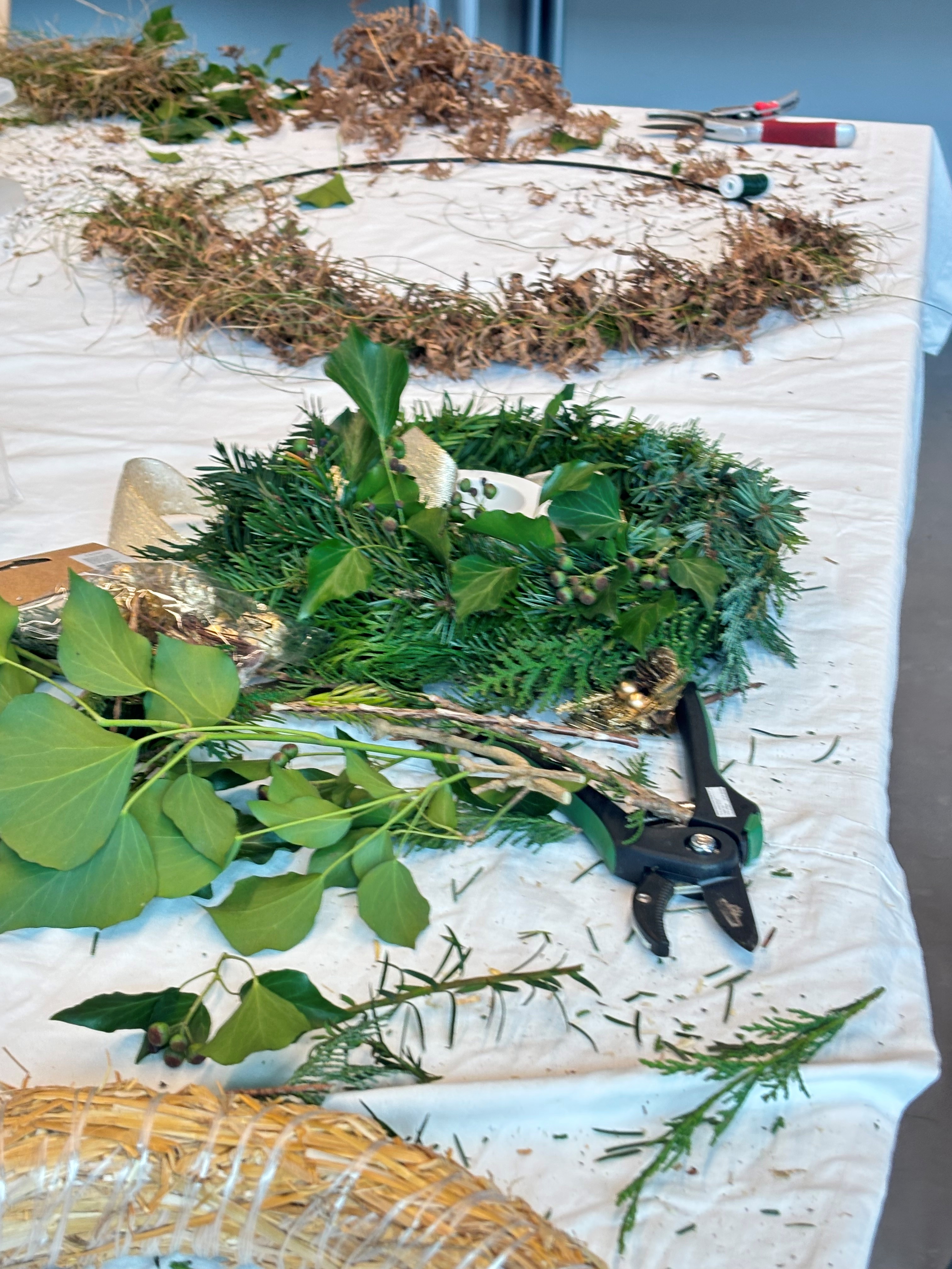 Die angenehme Atmosphäre des Workshops wurde durch viele persönliche Vorbereitungen geprägt. Sonja hatte im Vorfeld unzählige Grünzweige in der Natur gesammelt - Tanne, Fichte und andere heimische Gehölze und stellte diese für alle Teilnehmer bereit. Ihre fachkundige Anleitung half dabei, aus den mitgebrachten Strohkränzen und den natürlichen Materialien individuelle Adventskränze zu gestalten. Während in den Händen der Teilnehmer nach und nach die schönen Kränze entstanden, duftete es im Raum nach selbstgebackenem Apfelbrot, Christstollen und verschiedenen Keksen. Diese hausgemachten Köstlichkeiten sorgten für eine gemütliche Stimmung und Lust auf‘s Basteln.